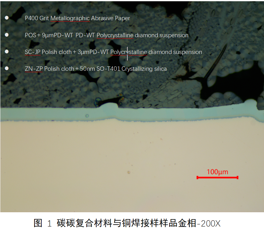 Tra le fiamme del veicolo spaziale rientrano nell'atmosfera e nel cuore del circuito di nuovi veicoli energetici, il duo "duro e saggio" di materiali compositi di carbonio carbonio e giunti saldati in rame stanno scrivendo una leggenda del materiale. Come ingegneri metallografici, come possiamo decifrare i suoi codici microscopici? Successivamente, ti porteremo in un viaggio per superare le difficoltà nella preparazione di materiali con diversa durezza e tenacità nei campioni di materiale composito di carbonio carbonio! Per i materiali compositi di carbonio carbonio e campioni di saldatura in rame, per garantire la piattaforma dell'interfaccia di saldatura preparata, si consiglia di utilizzare il metodo a quattro fasi POS PLASE per la preparazione. Di seguito è riportato il processo di preparazione del campione.
