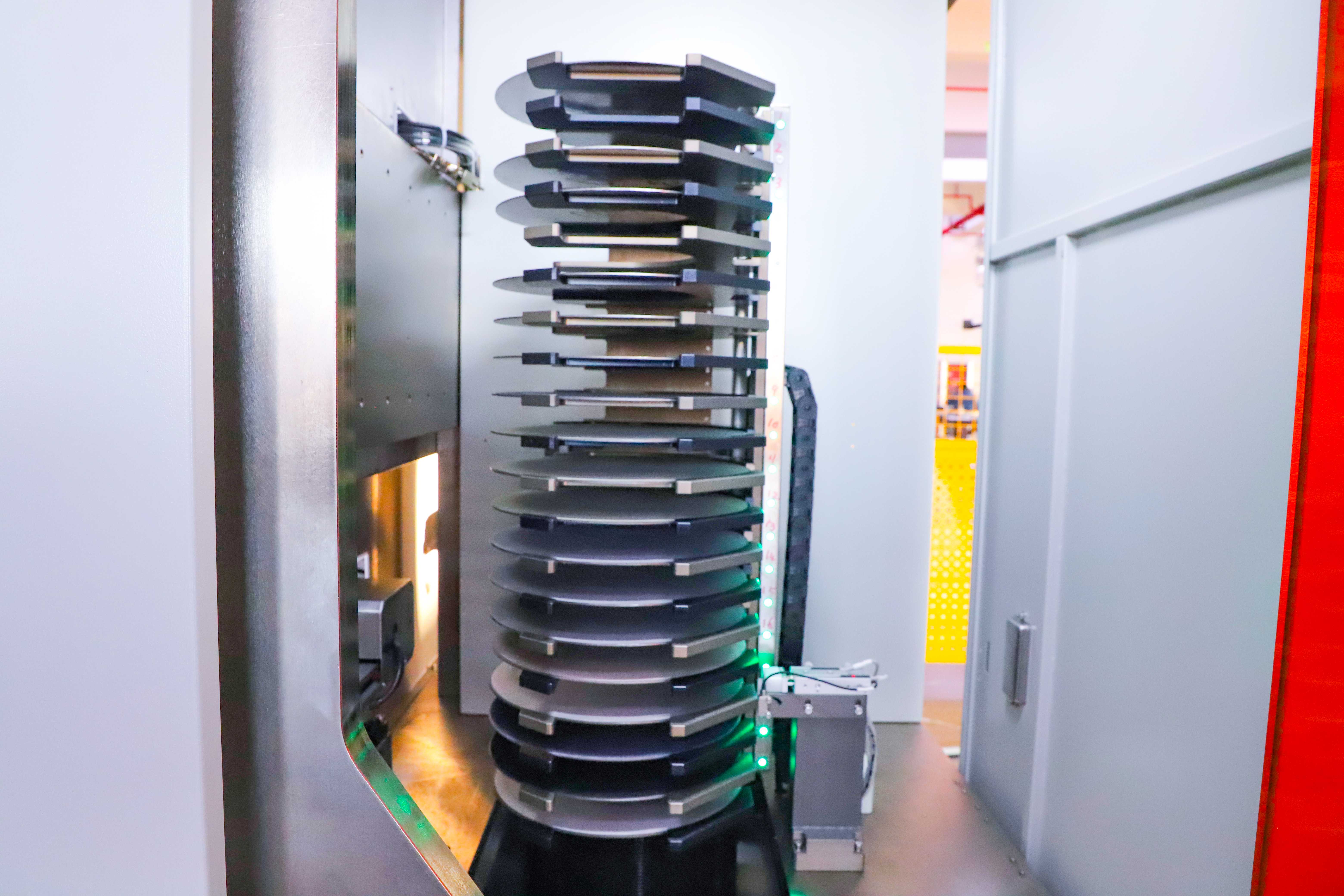 7)Doppie postazioni di lavoro con cambio automatico del disco abrasivo; può ospitare fino a 20 dischi abrasivi.